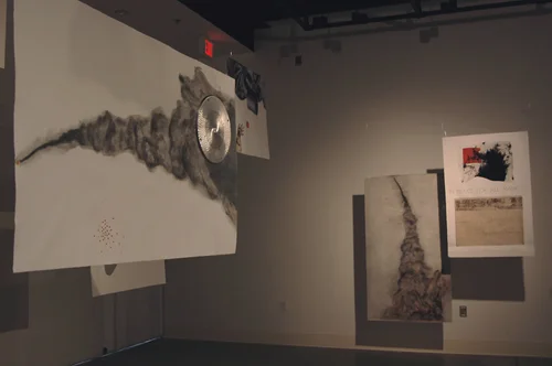In this installation I focused on how the printmaking process—through layering, folds, and display relationships—can express both the tautness and delicacy of experience and, eventually, communication. I am always interested in the behavior of paper and its relationship to pressure, atmosphere, or gravity. Further, working with stencil and monotype on folded paper allowed for adaptation and flexibility, but required continuous diagramming and calculation that a fixed matrix would not. In this way, the tenuousness and constant reorientation was embodied in the process.